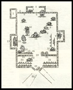 This diagram of Fort Mims is called the Claiborne Map, but in truth, we don’t know who drew it. It was probably drawn by one of General Claiborne’s men who came to bury the dead after the massacre.