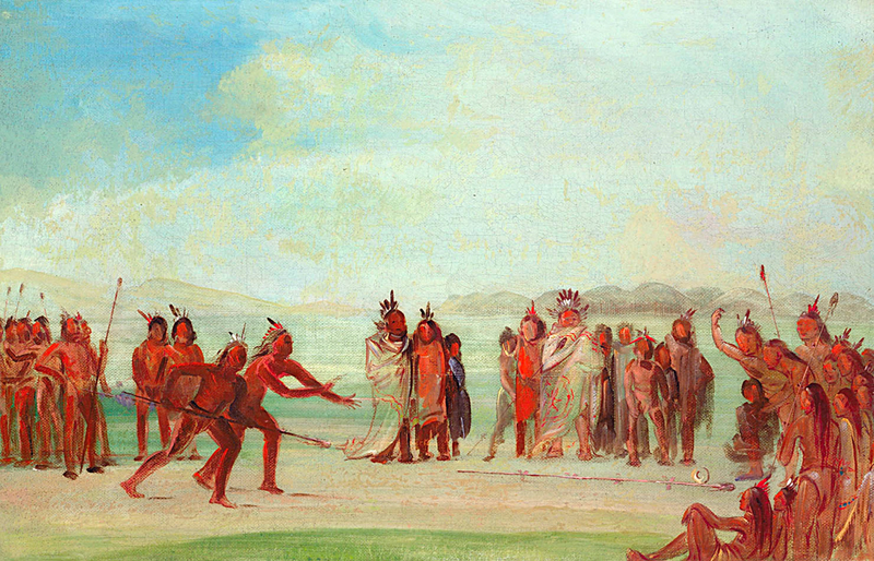 The game of Tchung-kee [is] a beautiful athletic exercise, which the Mandan seem to be almost unceasingly practicing whilst the weather is fair, and they have nothing else of moment to demand their attention. This game is decidedly their favourite amusement, and is played near to the village on a pavement of clay, which has been used for that purpose until it has become as smooth and hard as a floor. … The play commences with two (one from each party), who start off upon a trot, abreast of each other, and one of them rolls in advance of them, on the pavement, a little ring of two or three inches in diameter, cut out of a stone; and each one follows it up with his ‘tchung-kee’ (a stick of six feet in length, with little bits of leather projecting from its sides of an inch or more in length), which he throws before him as he runs, sliding it along upon the ground after the ring, endeavouring to place it in such a position when it stops, that the ring may fall upon it, and receive one of the little projections of leather through it.