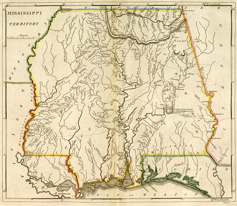Under the Treaty of Paris (1783) at the end of the Revolution, Spain was granted all of Louisiana as well as territory along the Gulf of Mexico, called East and West Florida. In 1798, Congress established the 31st parallel as the boundary between Spain and the United States and created the Mississippi Territory. It later expanded to the 32nd parallel (1802) when Georgia ceded lands to the federal government. The map below shows what the Territory, a vast region spreading from the Chattahoochee River to the Mississippi River, looked like in 1813, at the time of the Creek War.